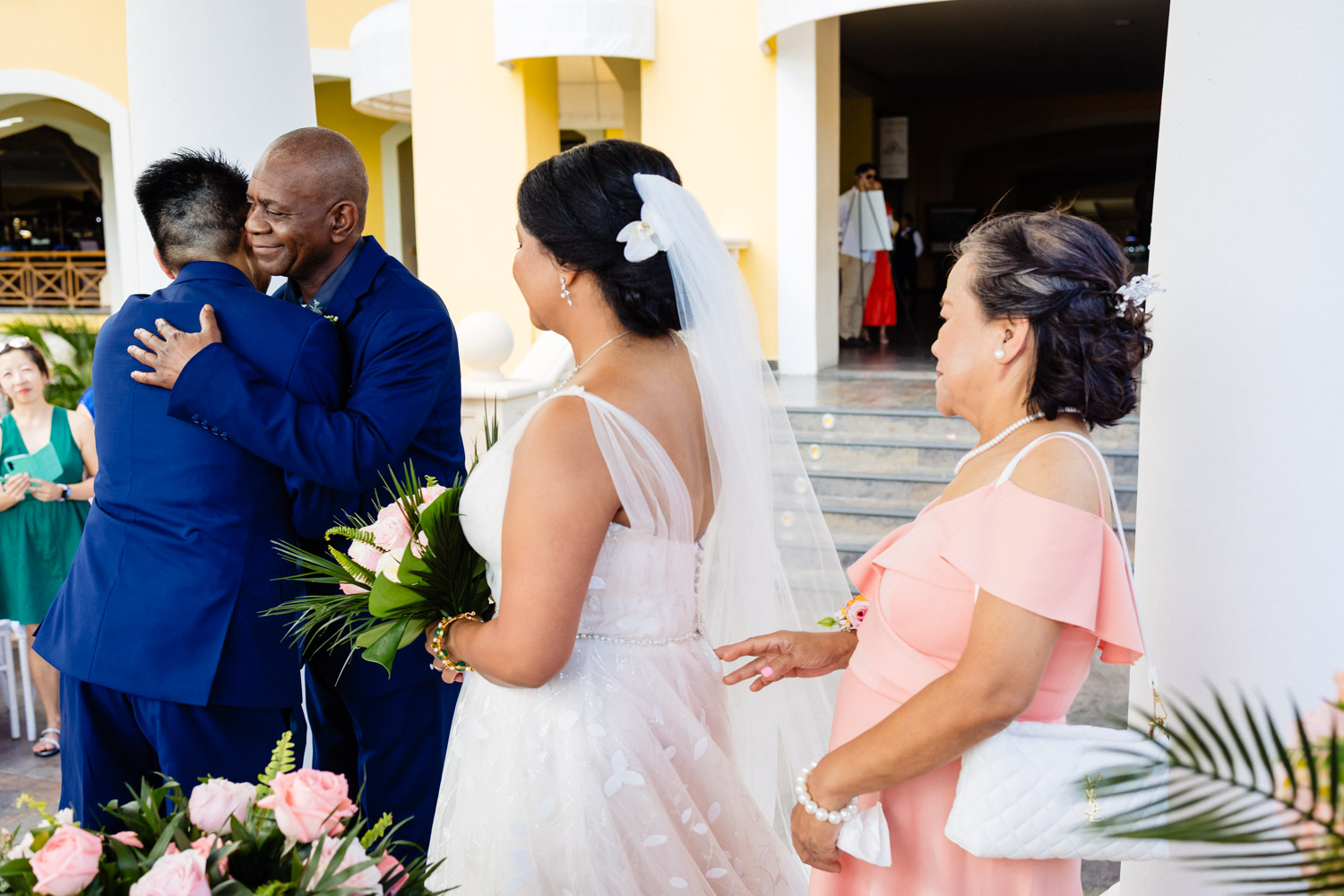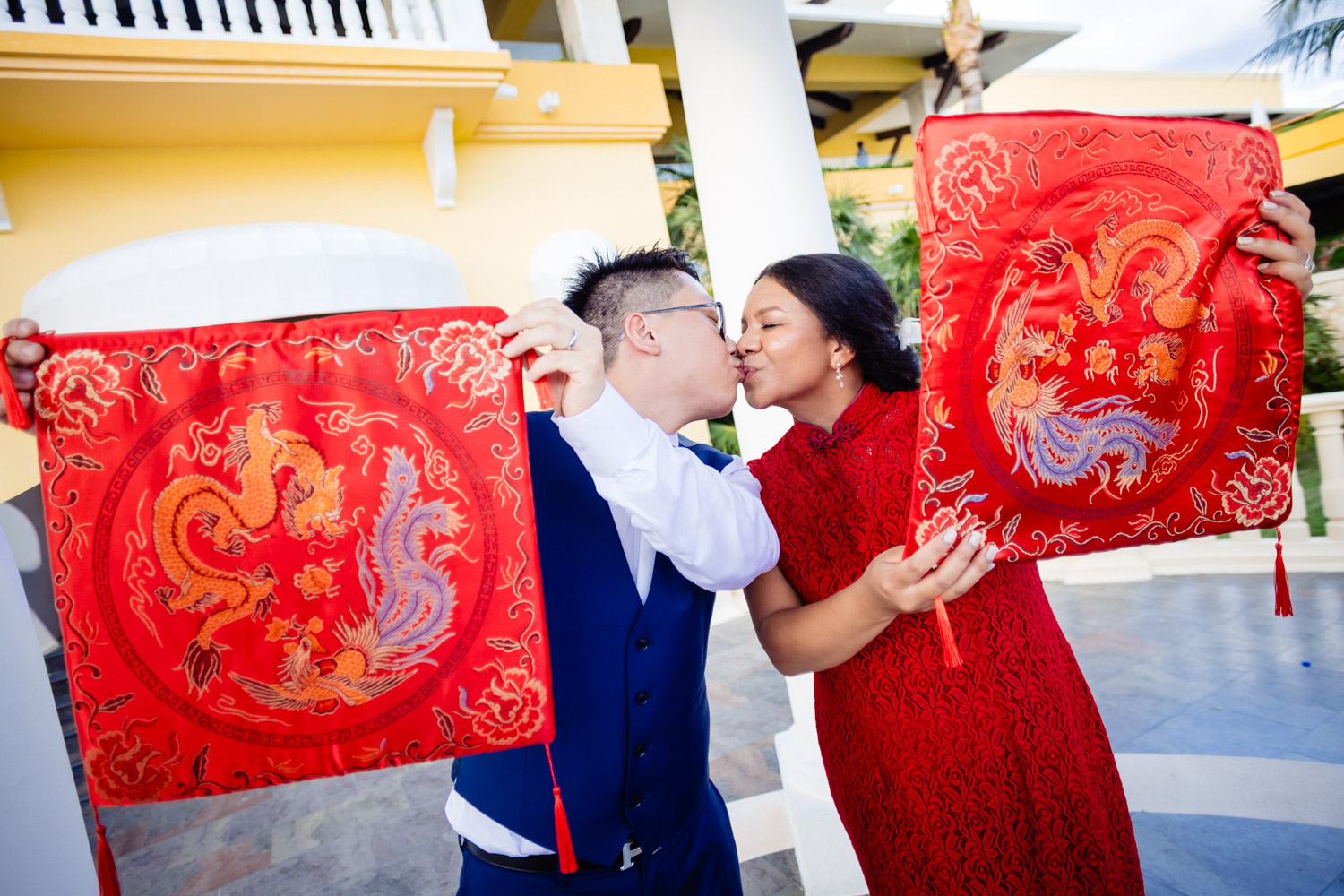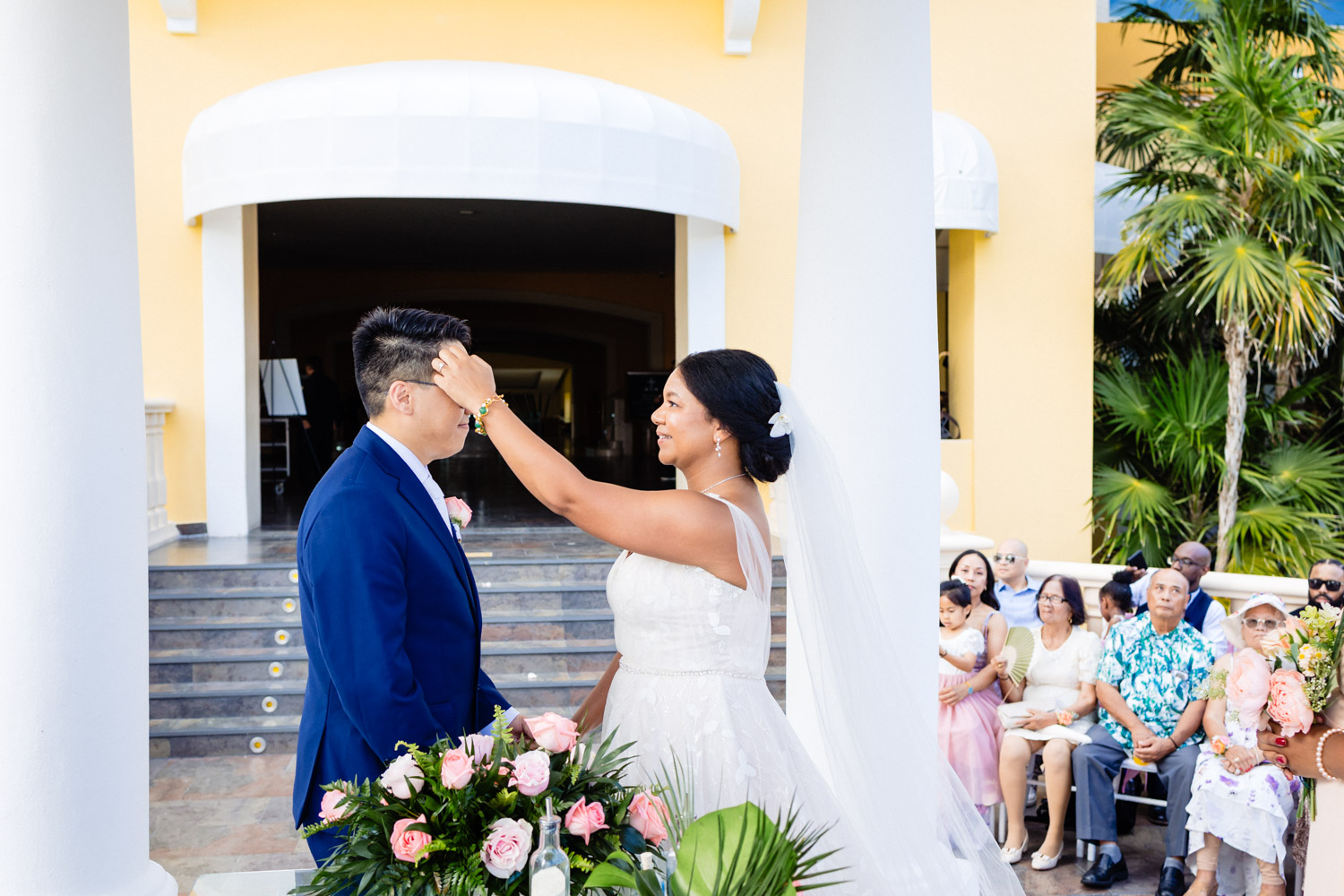 One of the most special moments of the day was their Chinese tea ceremony during cocktail hour. This beautiful tradition symbolizes respect, gratitude, and unity between families. It added a deeply emotional and cultural touch to their Barcelo Maya Palace wedding and created unforgettable moments for everyone present.