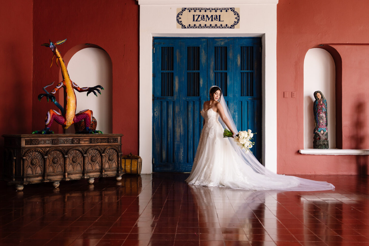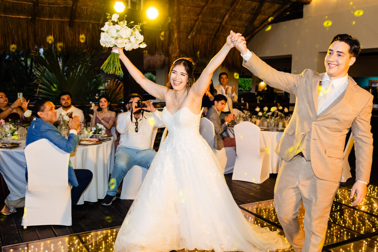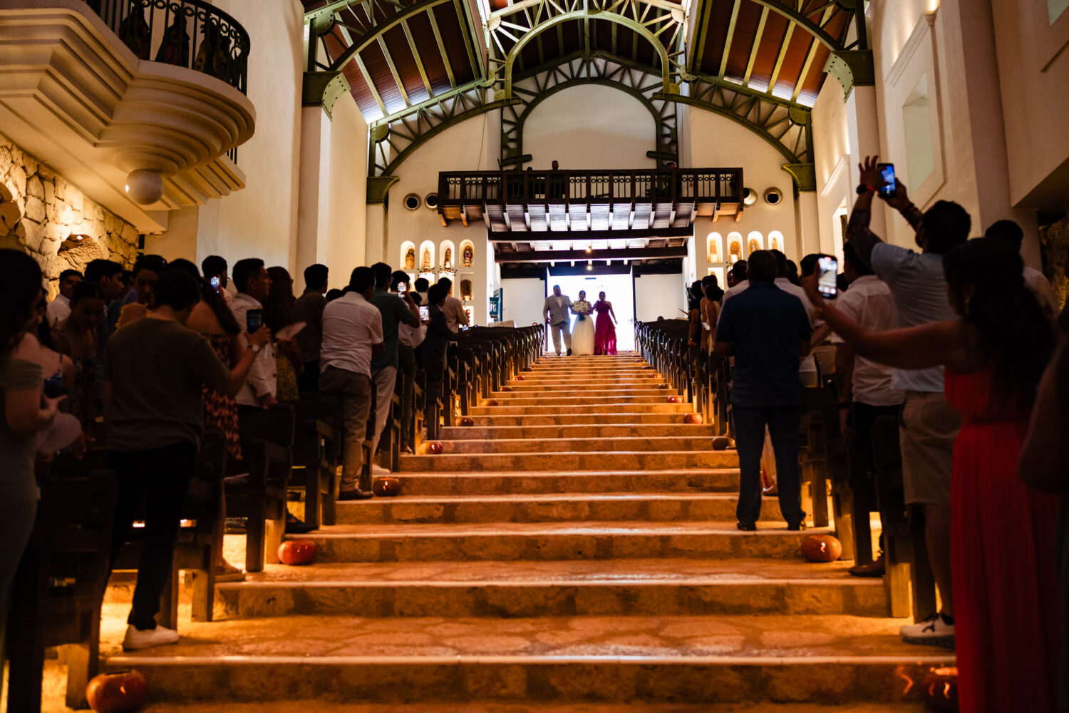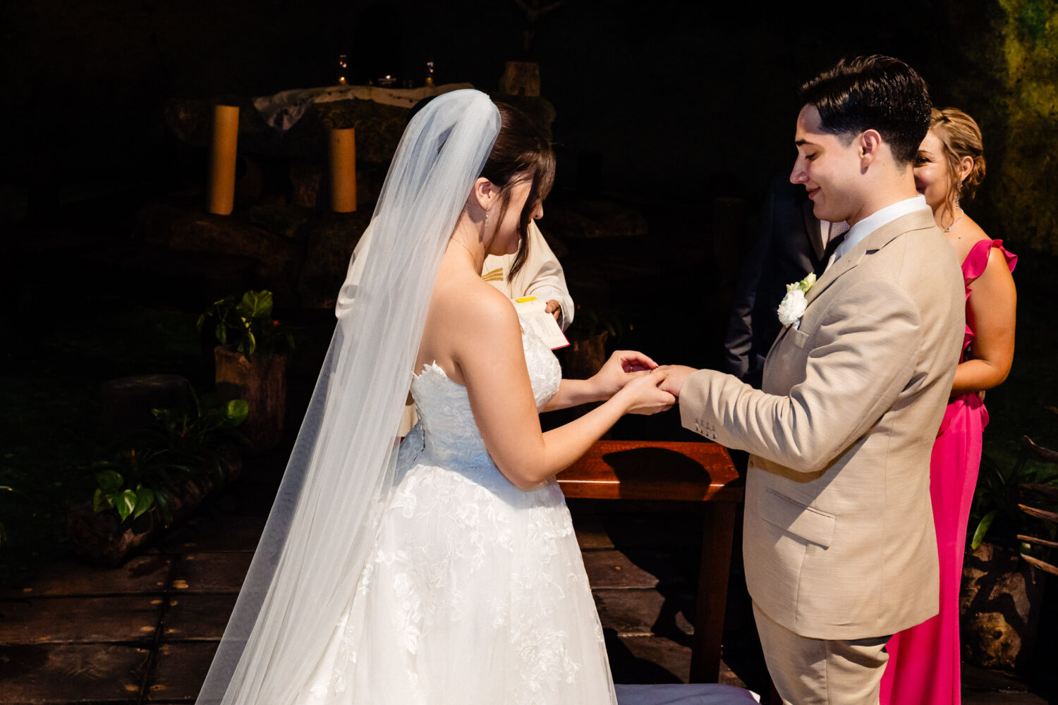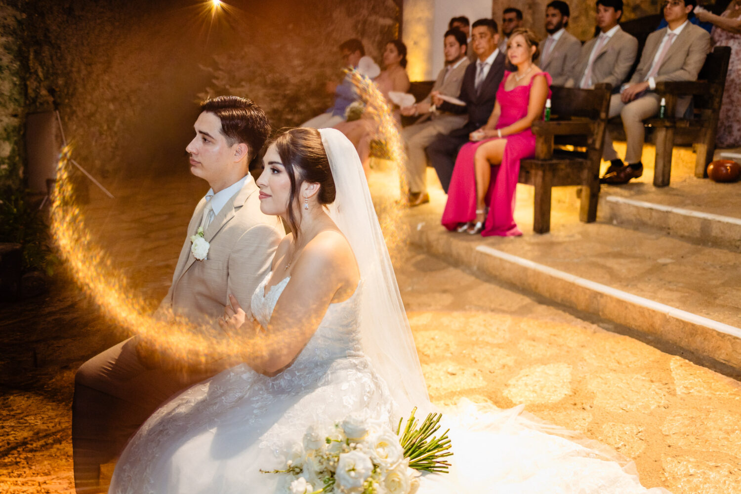 One of the highlights of their day was the ceremony at the iconic Capilla de Guadalupe, one of the most breathtaking wedding chapels in the Riviera Maya. This chapel is famous for its dramatic altar built directly over a cenote, illuminated by natural light reflecting off crystal-blue water. Behind the altar stands an impressive wooden sculpture of the Virgin of Guadalupe, carved from a massive tree trunk—an unforgettable backdrop that adds depth, tradition, and spiritual beauty to the moment.