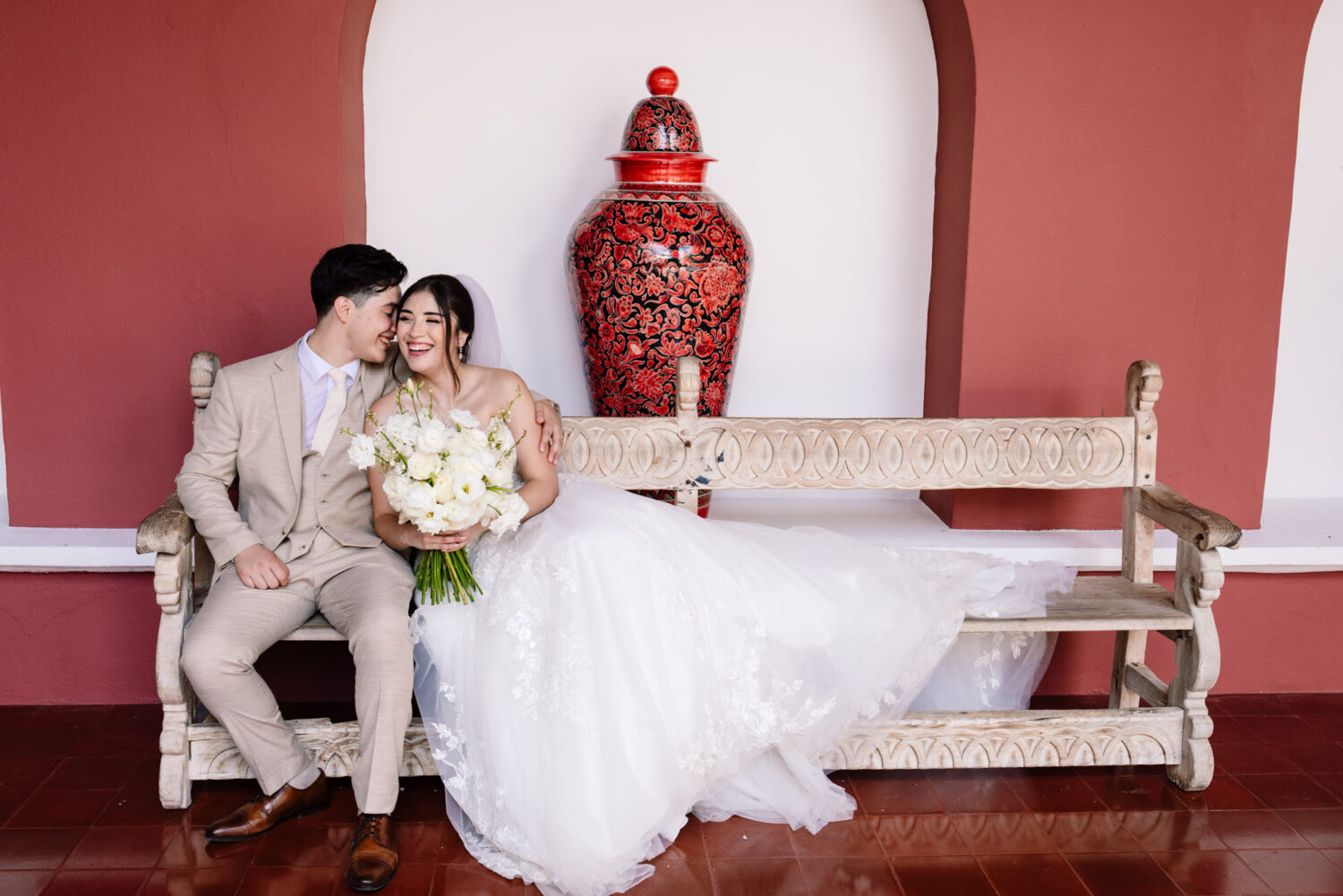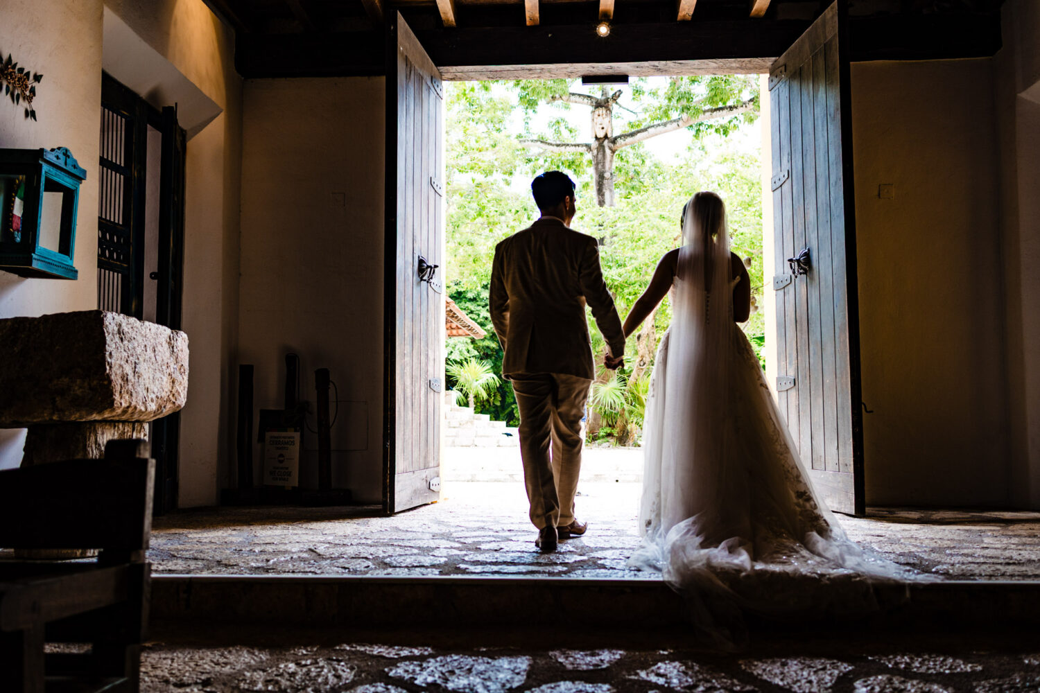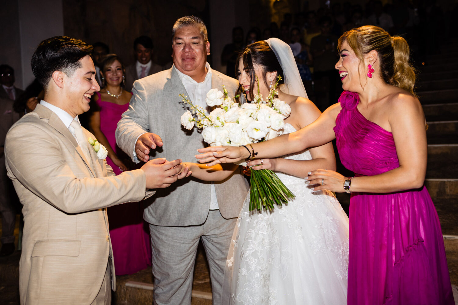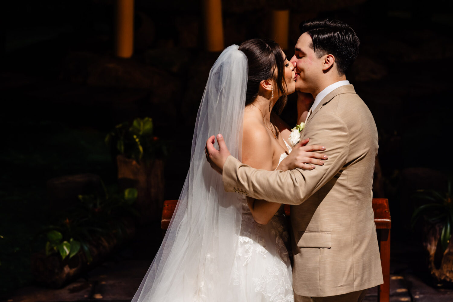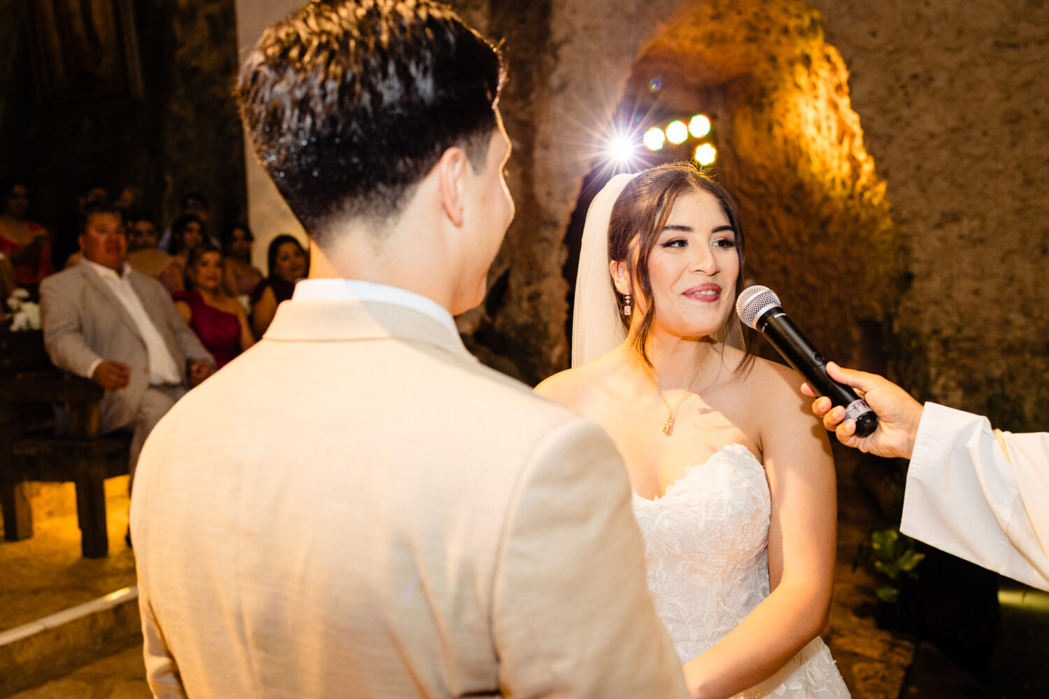 One of the highlights of their day was the ceremony at the iconic Capilla de Guadalupe, one of the most breathtaking wedding chapels in the Riviera Maya. This chapel is famous for its dramatic altar built directly over a cenote, illuminated by natural light reflecting off crystal-blue water. Behind the altar stands an impressive wooden sculpture of the Virgin of Guadalupe, carved from a massive tree trunk—an unforgettable backdrop that adds depth, tradition, and spiritual beauty to the moment.