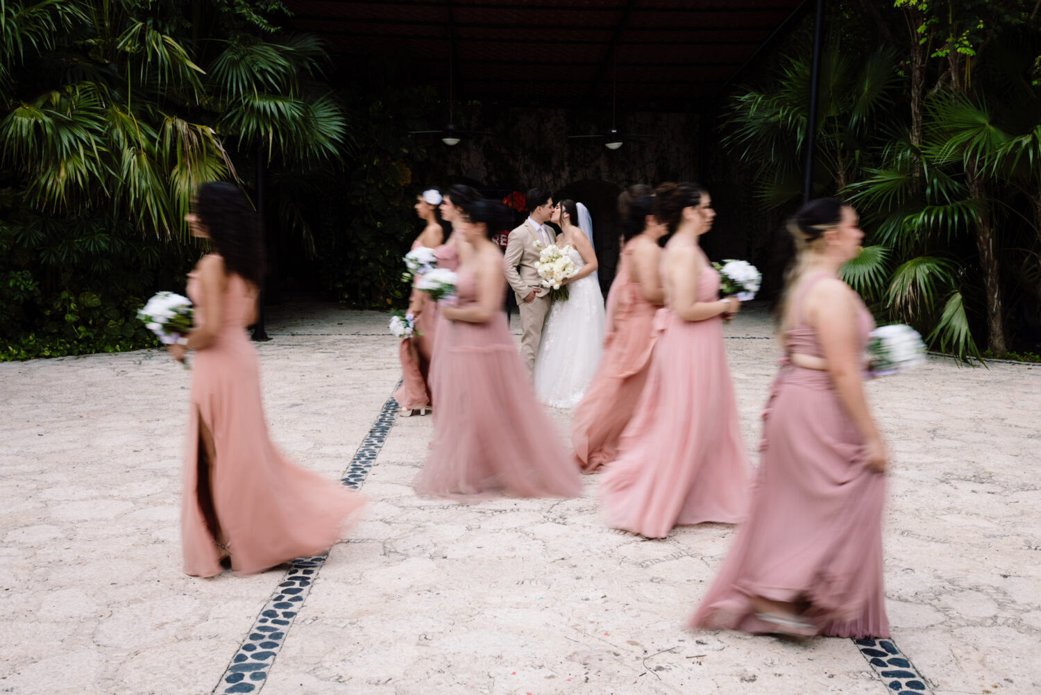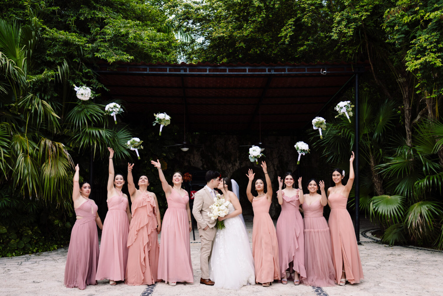 After the ceremony, we headed to the surrounding areas of the chapel and the natural pathways of Xcaret Park for the couple portraits and wedding party session. The blend of stone walls, tropical jungle, and soft natural light created the perfect atmosphere for storytelling photography.